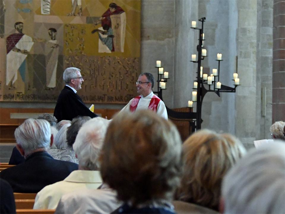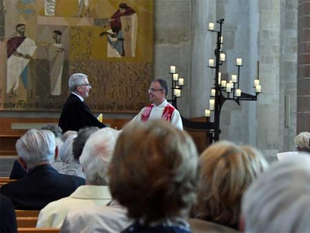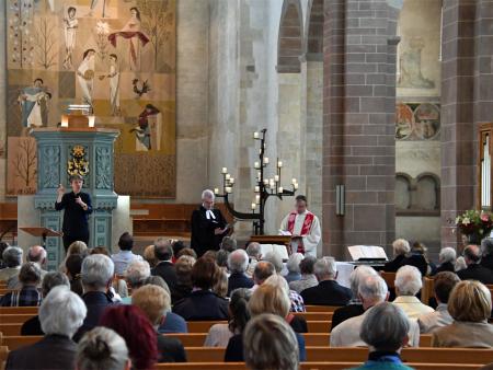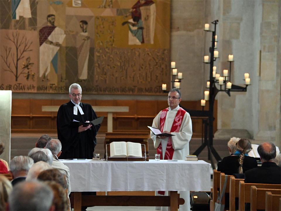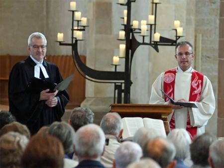 Thematisch stand der Gottesdienst unter dem Katechichmus des Schaffhauser Reformators Johann Conrad Ulmer. In der Dialogpredigt erörterten Pfarrer Urs Elsener und Pfarrer Matthias Eichrodt die Fragen "Was ist ein rechter Christ?" und "Soll man denn nach Gottes Geboten keine guten Werke tun, da der Glaube allein gerecht und selig macht?". Die Standpunkte der reformierten und katholischen Kirche wurden herausgeschält.