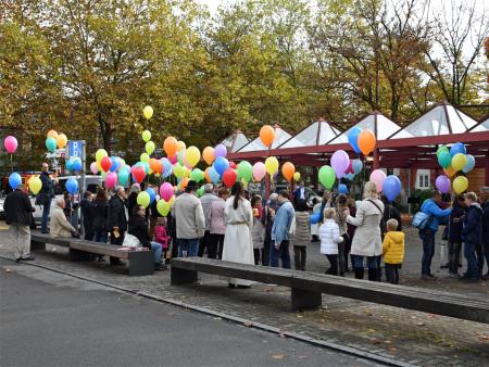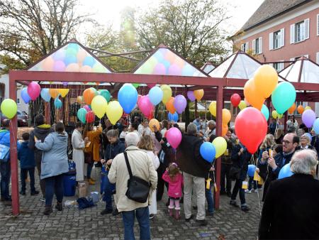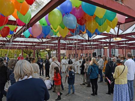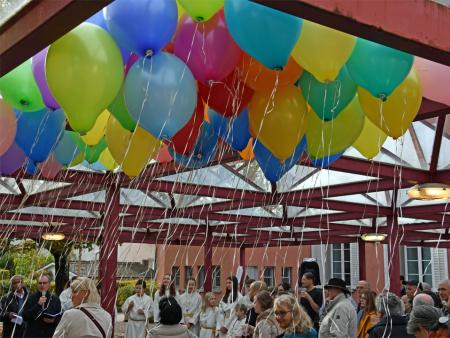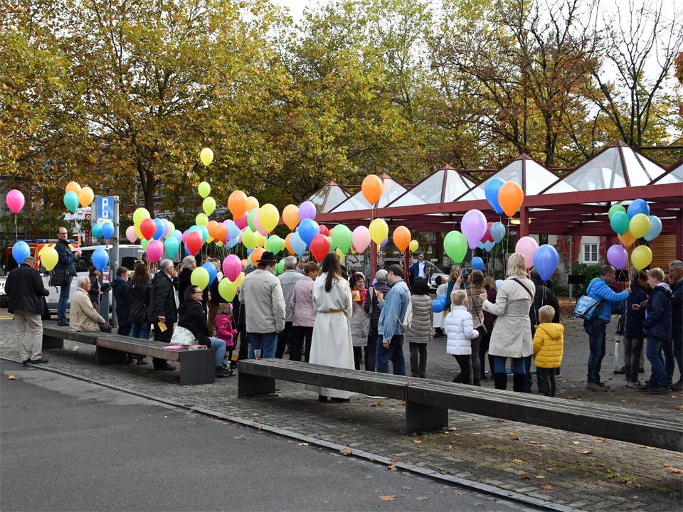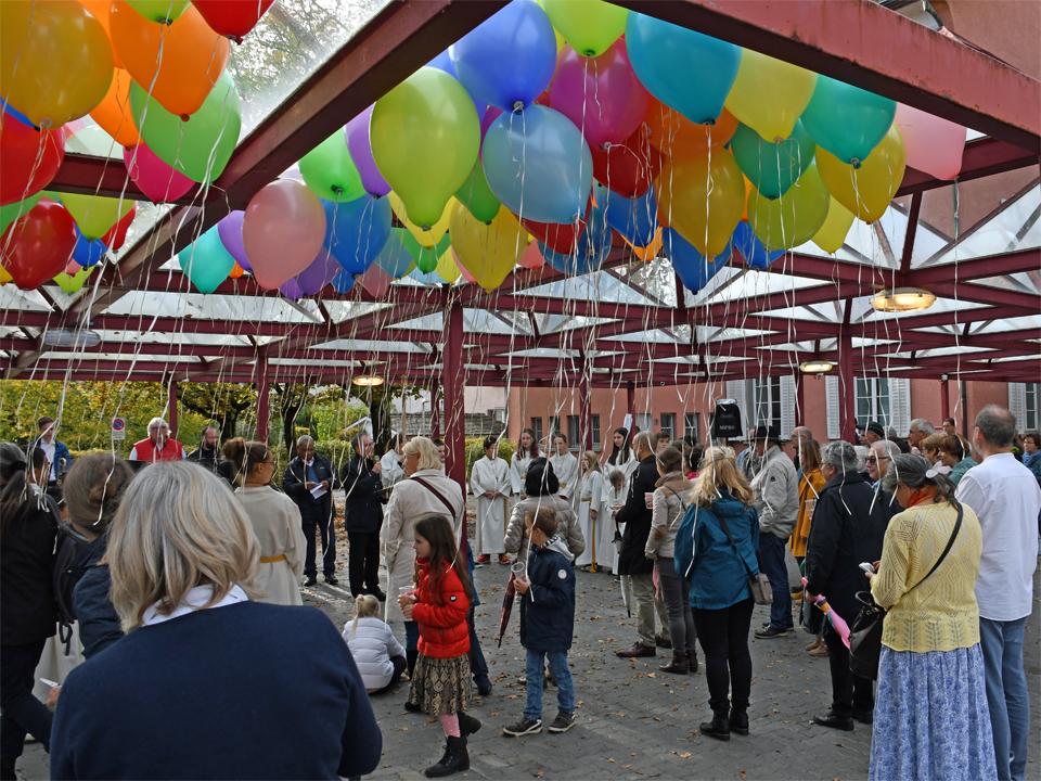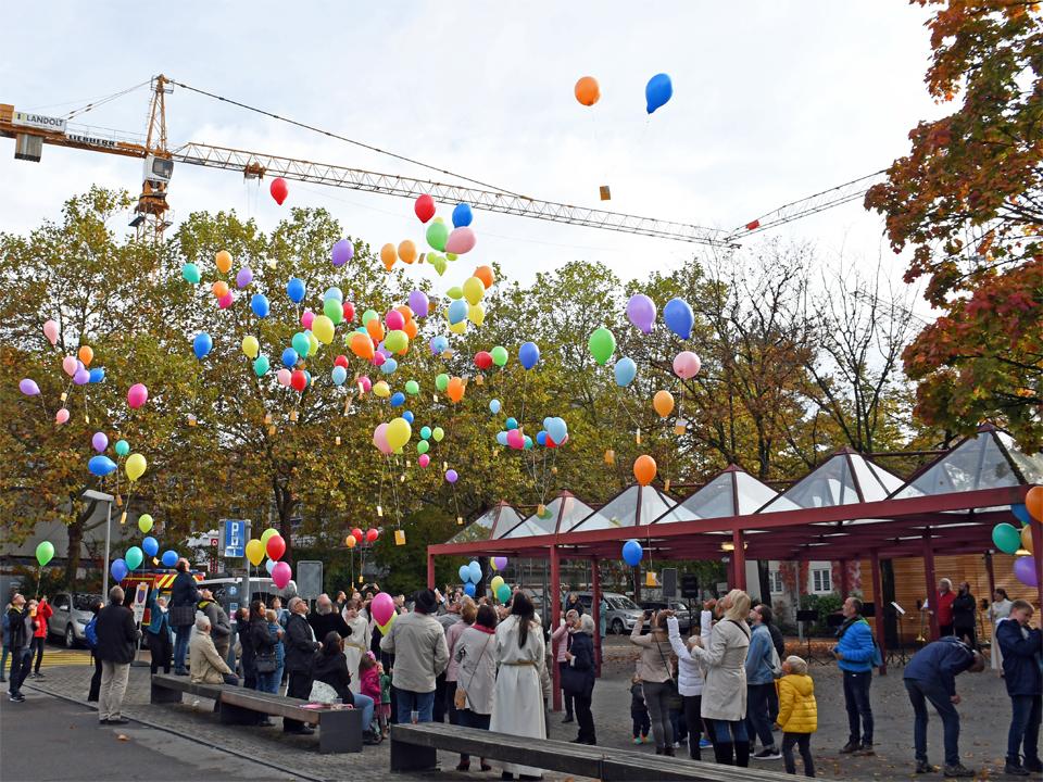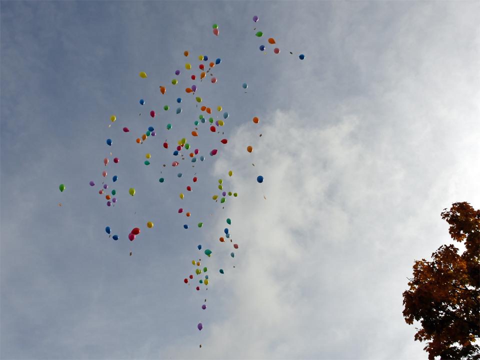 In der Zwischenzeit haben einige Freiwillige eine Menge Luftballons aufgeblasen. So bekamen alle Anwesenden eine Karte mit einem passenden Bibelspruch zum Thema "Getauft und gesandt". Nun galt es, die Karte auszufüllen und an den Ballon zu binden. Bald waren alle bereit und auf Kommando erhoben sich die Ballone in den blauen Himmel. Für die Ballone, welche den weitesten Weg zurückgelegt haben, wird es Preise geben.