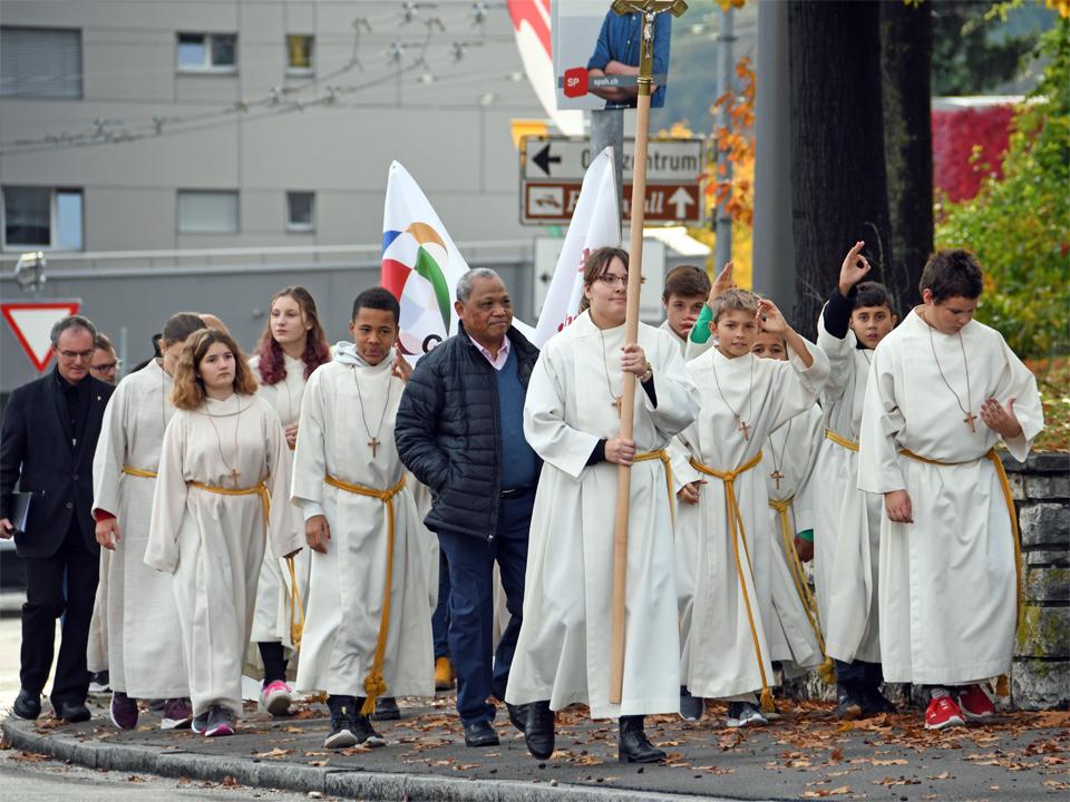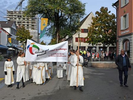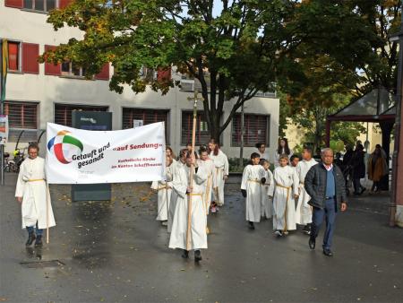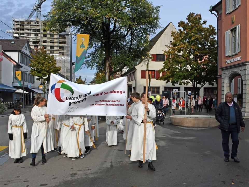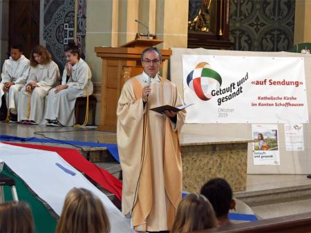 Am 19. Oktober 2019 durfte ich mit Katholikinnen und Katholiken aus den Pastoralräumen Neuhausen-Hallau und Schaffhausen-Reiat den ausserordentlichen Monat der Weltmission feiern. Die Begegnungen mit Gläubigen aller Generationen auf dem «Platz für alli» in Neuhausen, das gemeinsame Hören auf das Wort Gottes, die frohe Feier der Eucharistie und die anschliessende Teilete im Pfarreizentrum haben mir viel Freude bereitet. Ich danke allen, die vorbereitet haben. Ich danke für die Glaubensgemeinschaft.