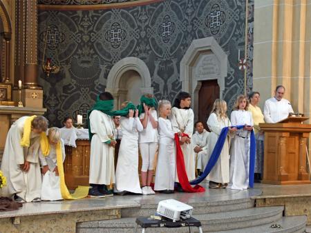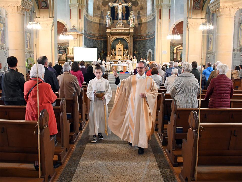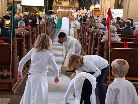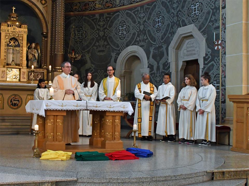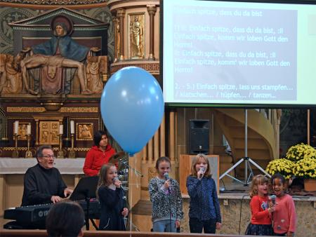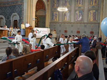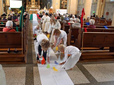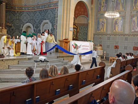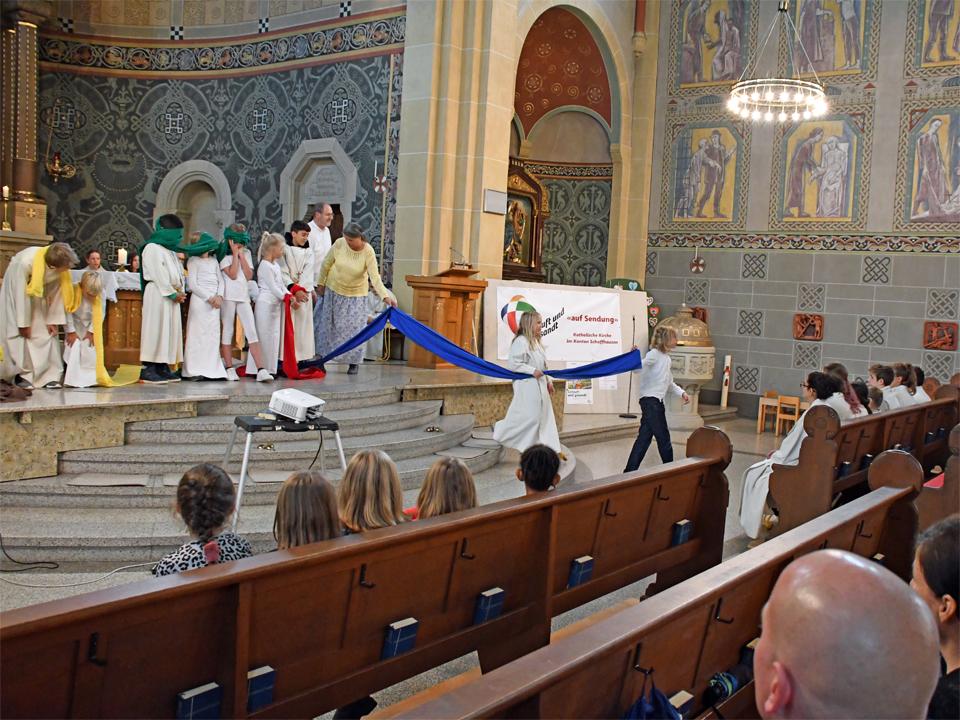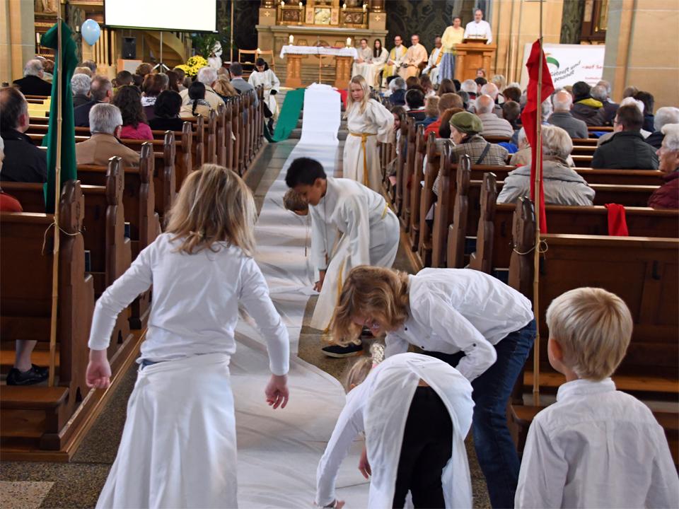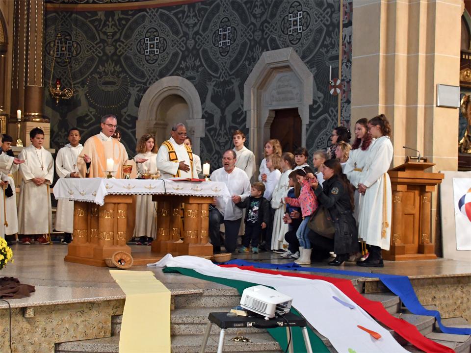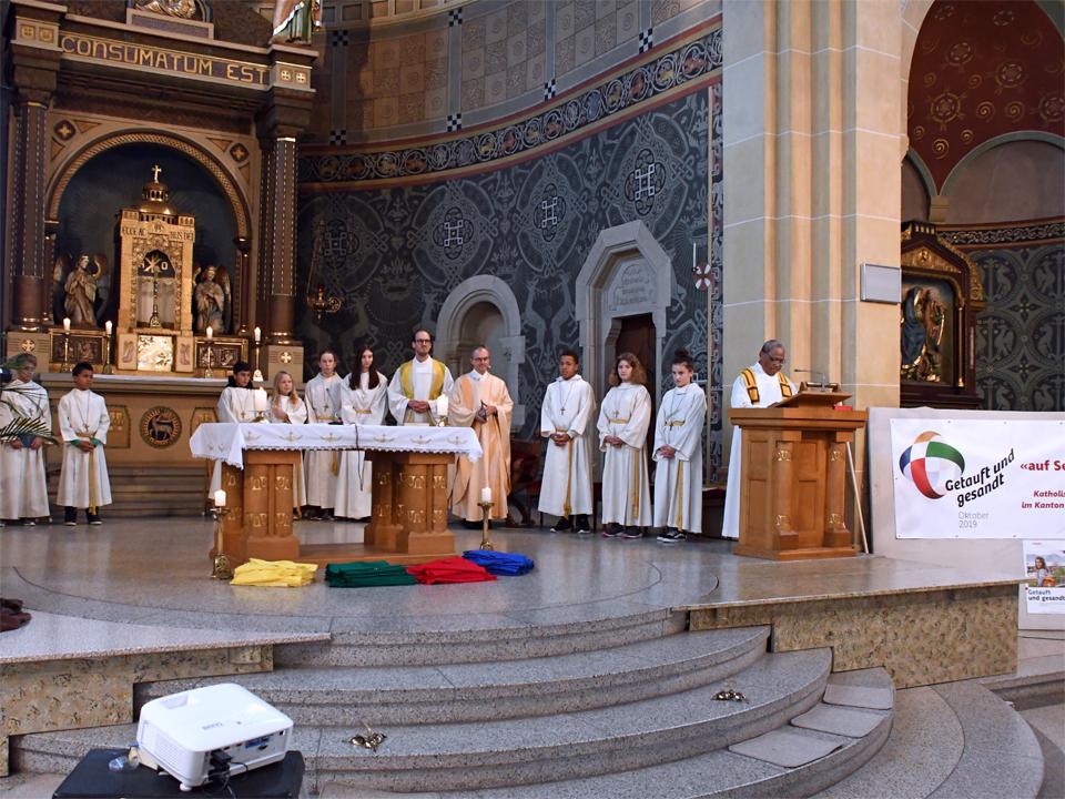 Während sich die Priester für den Gottesdienst umzogen, probten die "Singing Kids" einige der Lieder mit den GottesdienstbesucherInnen. Kindergerechte und fetzige Lieder luden mit Mitsingen ein. Kinder spielten das Evangelium zeichenhaft und verständlich nach und schufen so eine tolle Athmosphäre mit den farbigen Tüchern, welche durch die ganze Kirche gelegt waren. In der Predigt ging Generalvikar Markus Thürig auf das Evangelium ein und sprach auch die Kinder an. Eine würdige Feier durften wir miteinander erleben.
