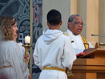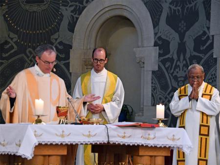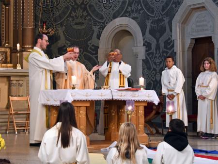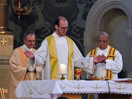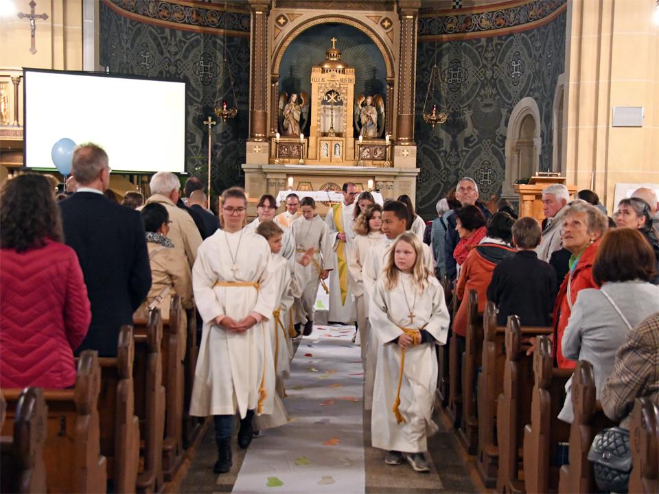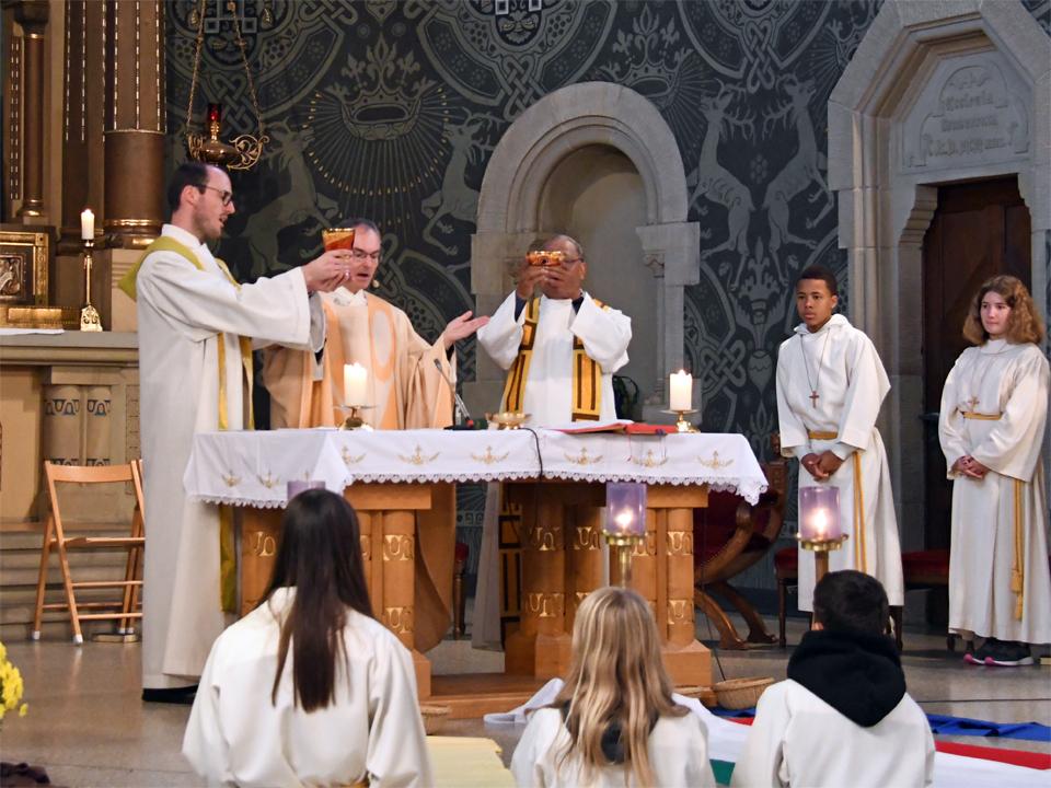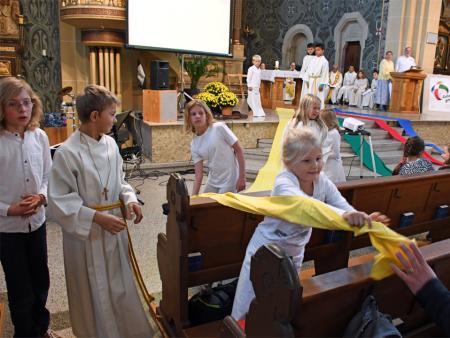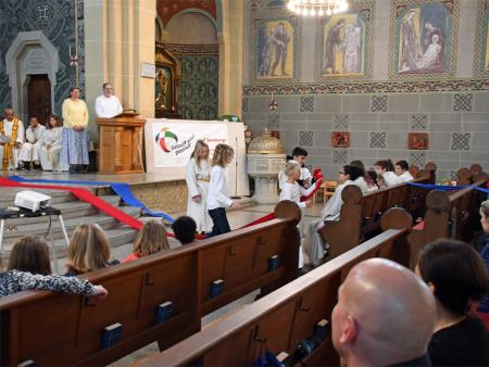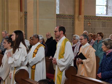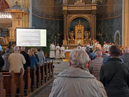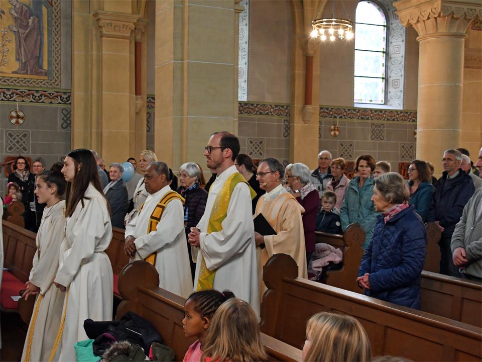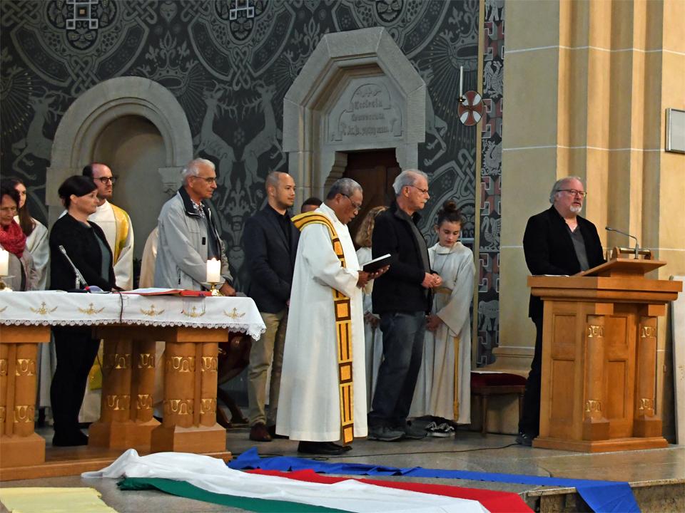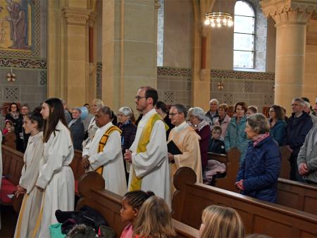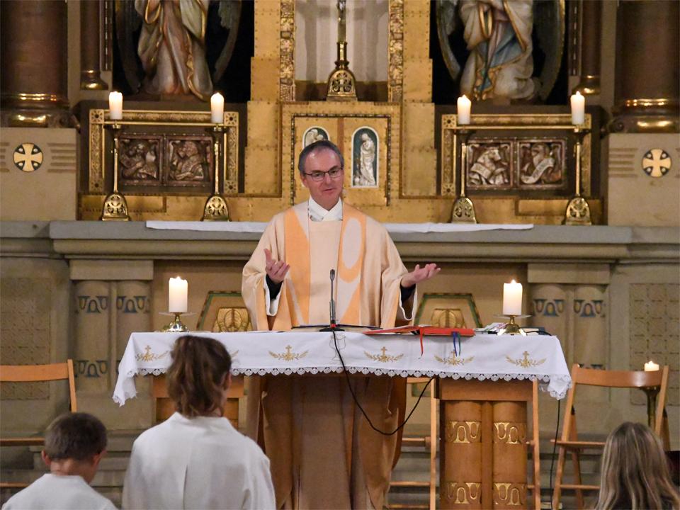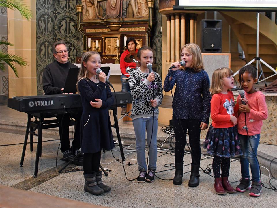 Während sich die Priester für den Gottesdienst umzogen, probten die "Singing Kids" einige der Lieder mit den GottesdienstbesucherInnen. Kindergerechte und fetzige Lieder luden mit Mitsingen ein. Kinder spielten das Evangelium zeichenhaft und verständlich nach und schufen so eine tolle Athmosphäre mit den farbigen Tüchern, welche durch die ganze Kirche gelegt waren. In der Predigt ging Generalvikar Markus Thürig auf das Evangelium ein und sprach auch die Kinder an. Eine würdige Feier durften wir miteinander erleben.