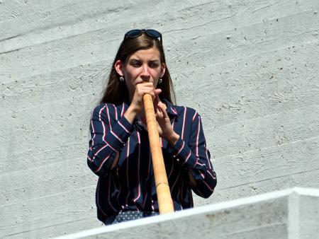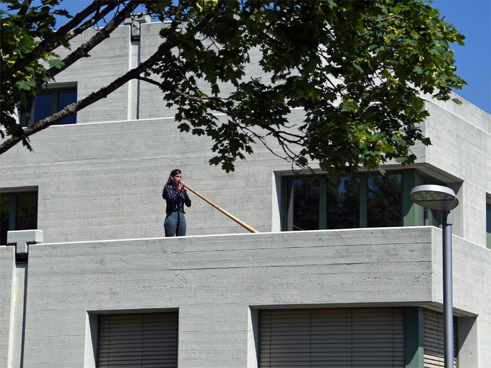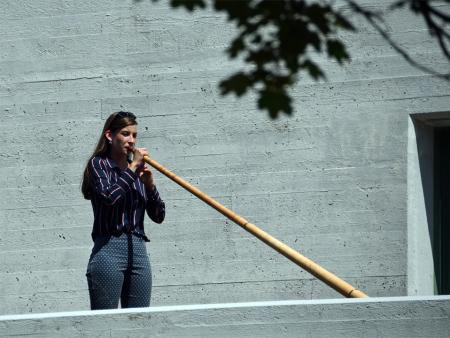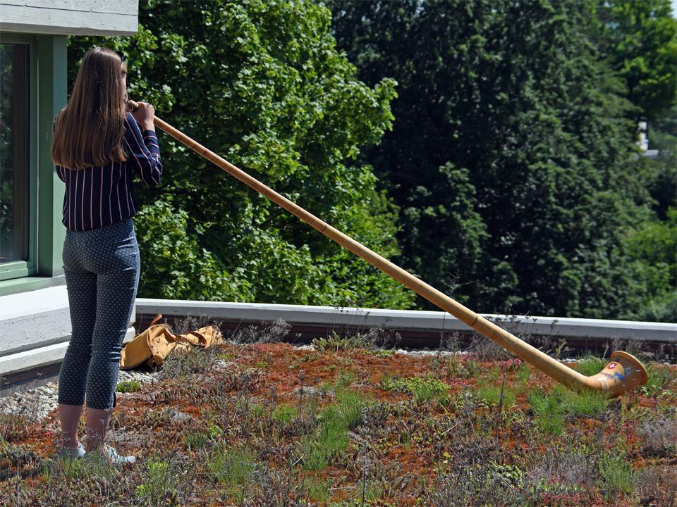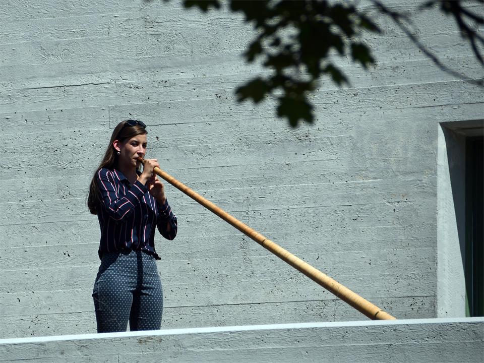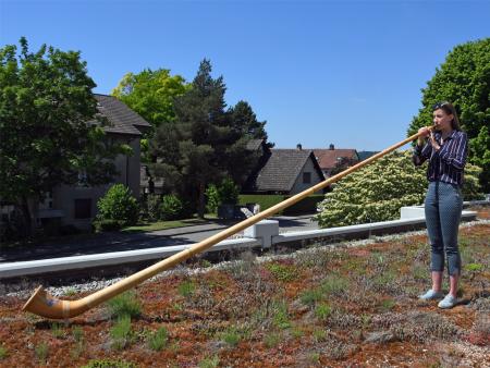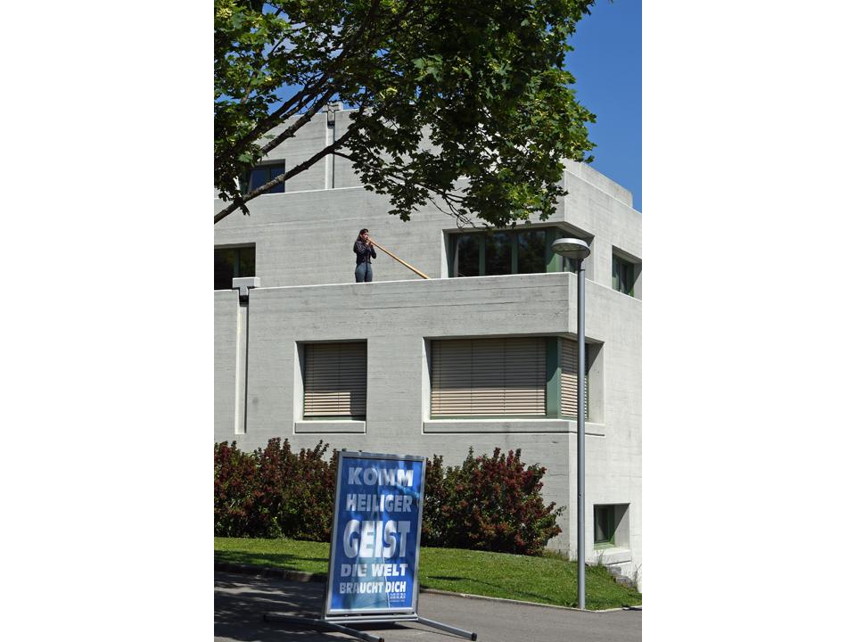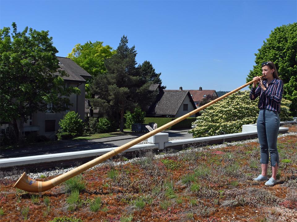 Lisa Stoll hat während einer Viertelstunde mit dem Alphorn auf dem Dach der Kirche St. Konrad gespielt. Die urchigen Klänge hallten durch das Grubental und die Menschen konnten von ihrem Balkon, dem Garten oder vom offenen Fenster aus zuhören und in den Dank einstimmen.