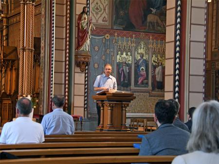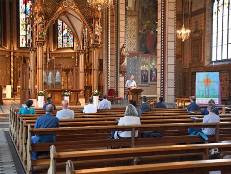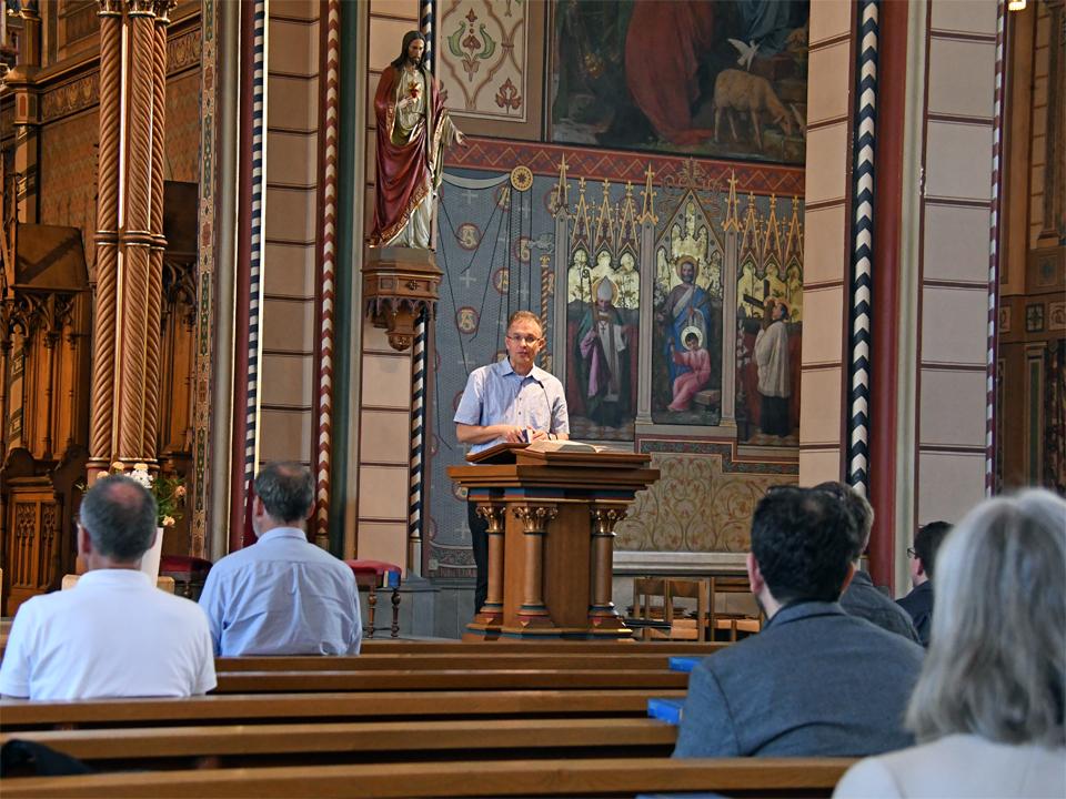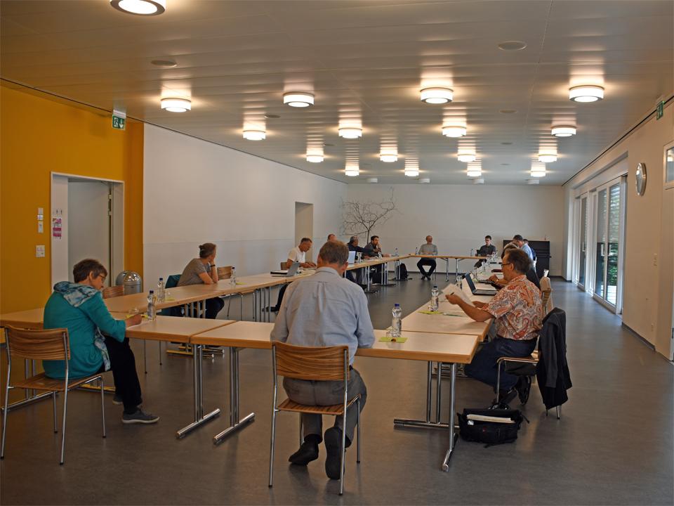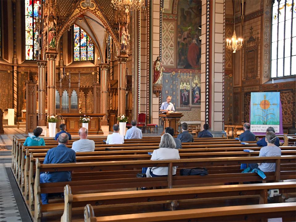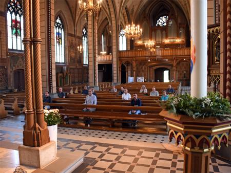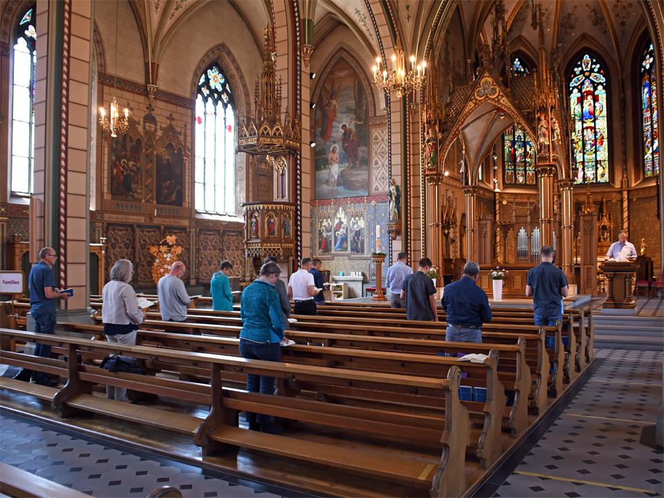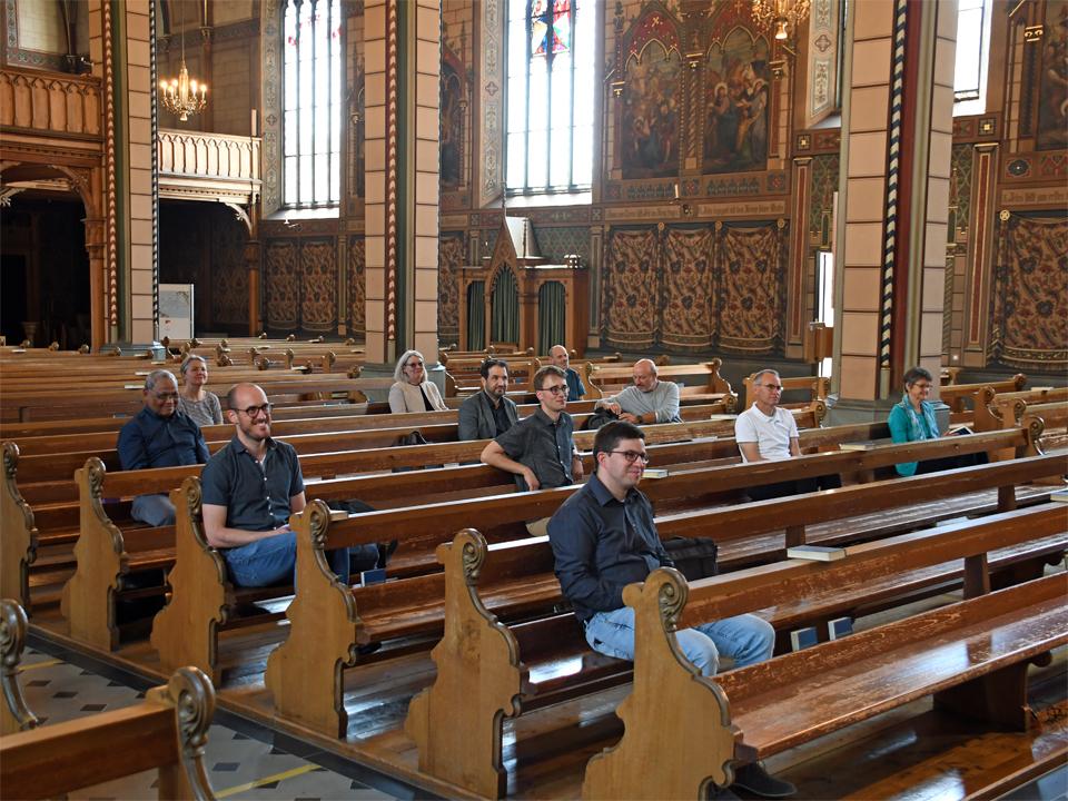Die Mitglieder der Pastoralkonferenz Schaffhausen treffen sich zum Austausch in St. Maria. Nach einem Impuls zu Pfingsten in der Kirche mit Test der Abstandsregeln in den Kirchenbänken findet die reguläre Sitzung entsprechend den Hygienemassnahmen und den Abstandsrichtlinien konform im Antonius-Saal statt.